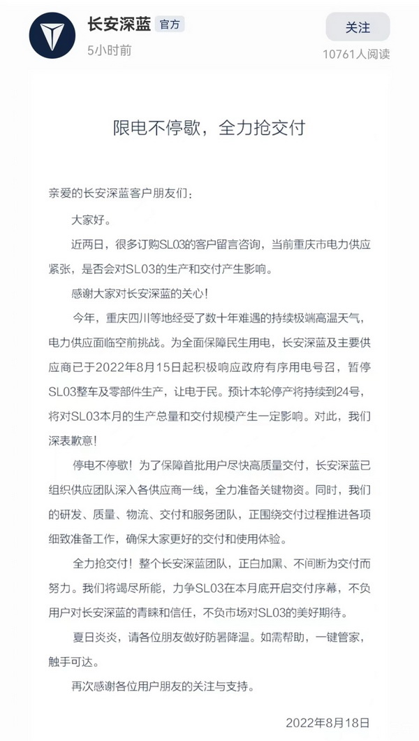 官方发的消息显示,因重庆四川等地经受了数十年难遇的持续极端高温天气,正常生活电力供应紧张,为全面保障民生用电,长安深蓝及主要供应商已于2022年8月15日起暂停SL03整车及零部件生产。