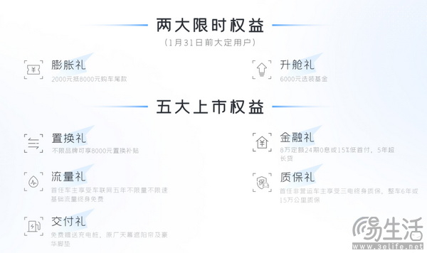 目前,官方为1月31日前大定的用户提供了2000元抵8000元购车尾款的膨胀礼、6000元选装基金的升舱礼、8000元置换补贴的置换礼、8万定额24期0息或15%低首付5年超长贷款的金融礼,以及质保礼流量礼和交付礼等权益。