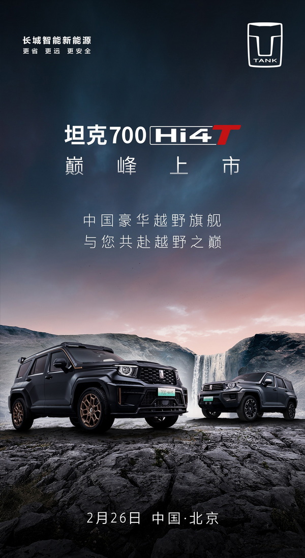 坦克品牌官方日前消息,旗下坦克700 Hi4-T将于2月26日正式上市,此前这款车型已开启预售,极致版和极境版两款车型的预售价格分别为46.8万元和50.8万元。新车定位中大型SUV,拥有三把差速锁等硬核越野配置,外观方面延续硬朗的外观设计,动力方面则搭载3.0T涡轮增压汽油机+9HAT变速箱并匹配P2电机,综合功率达到385kW、综合扭矩800牛·米。