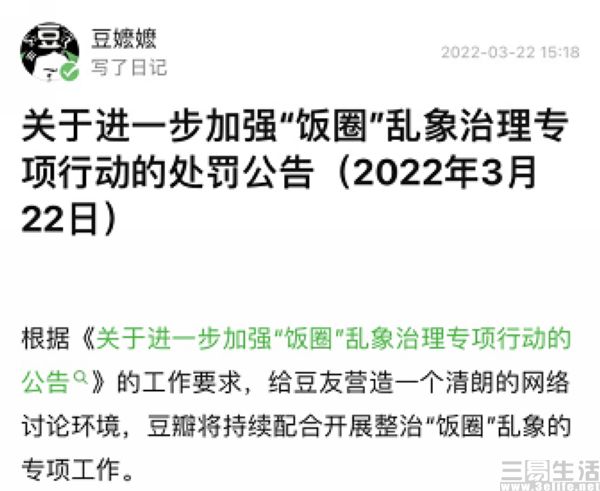日前,豆瓣方面发布了《关于进一步加强“饭圈”乱象治理专项行动的处罚公告》,宣布解散15个问题小组,并表示根据《关于进一步加强“饭圈”乱象治理专项行动的公告》的工作要求,给豆友营造一个清朗的网络讨论环境,将持续配合开展整治“饭圈”乱象的专项工作。