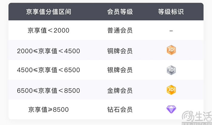 具体而言,京享值<2000为普通会员,2000≤京享值<4500为铜牌会员,4500≤京享值<6500为银牌会员,6500≤京享值<8500为金牌会员,京享值>8500则为钻石会员。而关于定级,每月25日京东方面将根据用户近365天的消费分、近60天的活跃分,以及账户分计算初始评估分、并进行定级,定级后可能会产生等级的变化。从26日开始截止次月25日,每日在初始评估分基础上,用户可累加前一天的行为加分(退货除外),具体加分规则与先前一致。