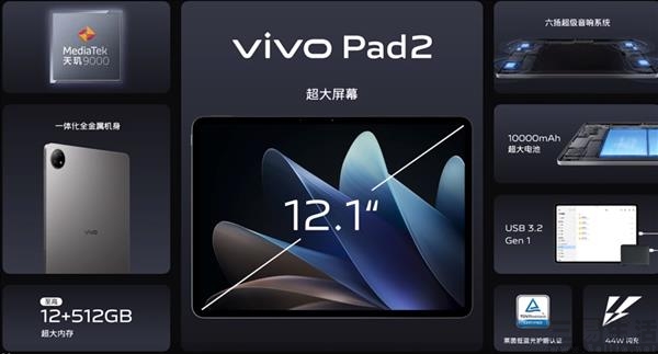 硬件配置上,vivo Pad2采用的是一块具备最高144Hz刷新率,2.8K分辨率的7:5比例12.1英寸屏幕,搭载联发科天玑9000主控,以及最高12GB+512GB的存储组合,提供1000mAh电池、并支持44W有线快充。影像方面所配备的是800万像素前摄,以及由1300万像素主摄+200万像素双副摄组成的后置多摄模组,此外还支持新款手写笔与智能触控键盘等配件。
