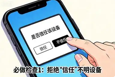 但在移动端,情况就略有不同,仅仅将共享充电宝改造成恶意程序的本体只是第一步,不法分子还需要让受害者主动解除防护才行。为了保护手机免受木马病毒的攻击,手机想要连接电脑等外部设备时就需要用户主动授权,比如在Android端要打开“USB调试模式”,iOS端则需要通过“要信任此电脑”选项。
