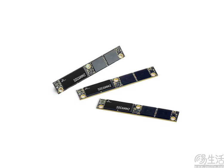 那么这是什么呢?它其实是SK海力士专为服务器设计的新款内存规格,名为“SOCAMM2”。与传统的插拔式(DIMM)内存相比,它的厚度更薄、占据空间更小,而且与主板之间的连接器接触面积更大,可以让内存运行在更高的频率、降低故障率,并因此获得性能(内存带宽)增益。