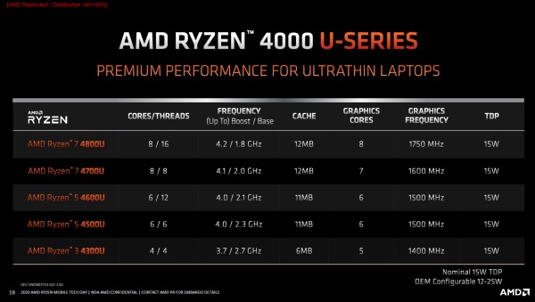 步入2020年,AMD正式推出备受瞩目的锐龙4000系列移动处理器。全新的锐龙4000系列移动处理器包括面向轻薄本的锐龙4000U系列、针对游戏本的锐龙4000H系列,这些处理器最大的变化是将制程从上一代的12nm升级至现在的7nm,同时处理器架构也从上一代采用的“Zen+”升级到现在的“Zen 2”。