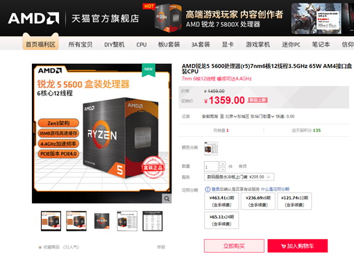 AMD锐龙5 5600天猫购买链接:
