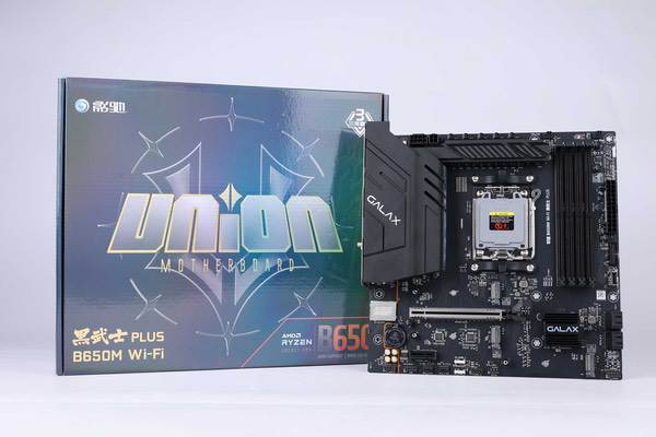 影驰联盟 B650M Wi-Fi 黑武士 PLUS主板的外盒设计延续家族风格,以纯黑色为底色,正面视觉焦点集中在“union”大写标志与“B650M Wi-Fi 黑武士 PLUS”产品名称上。右下角标注主板B650芯片组、兼容CPU范围,右上角则保留了“三年质保”标志,为用户售后保障。